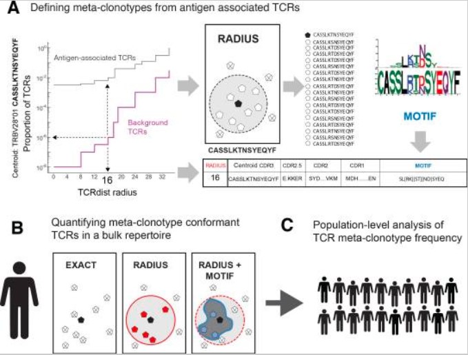 图1:描述了一种用于识别和量化抗原特异性T细胞受体(TCR)的计算方法,称为“meta-clonotype(元克隆型)”构建与分析流程。