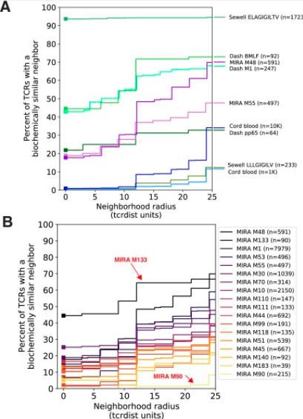 举例:MHC四聚体分选的TCR(绿色)通常在小半径下就有很高覆盖比例,因为它们识别同一表位,序列高度相似;而脐带血(蓝色)则需要很大半径才能让TCR“互相靠近”,说明多样性高、聚集性低。