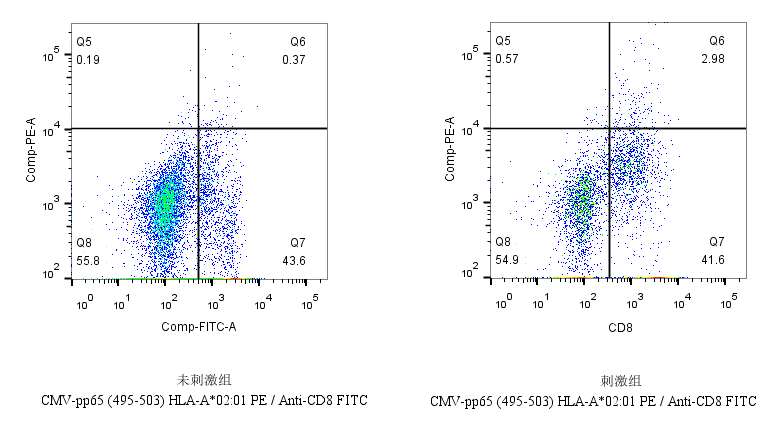 NLVPMVATV多肽刺激HLA-A*02:01限制性PBMC后,使用CMV-pp65 (495-503) HLA-A*02:01 PE 四聚体和抗CD8-FITC抗体检测。以未加抗原肽的细胞培养组为对照。