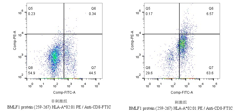 GLCTLVAML多肽刺激HLA-A*02:01限制性PBMC后,使用BMLF1 protein (259-267) HLA-A*02:01 PE 四聚体和抗CD8-FITC抗体检测。以未加抗原肽的细胞培养组为对照。