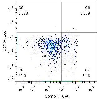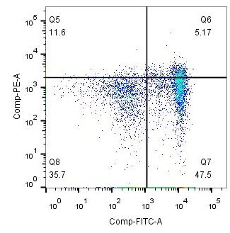 RAHYNIVTF多肽刺激H2Kb 限制性PBMC后,使用Protein E7 (49-57)H2Kb 四聚体和抗CD8-FITC抗体检测。下图左图为抗原肽RAHYNIVTF刺激组,右图为未加抗原肽刺激组。
